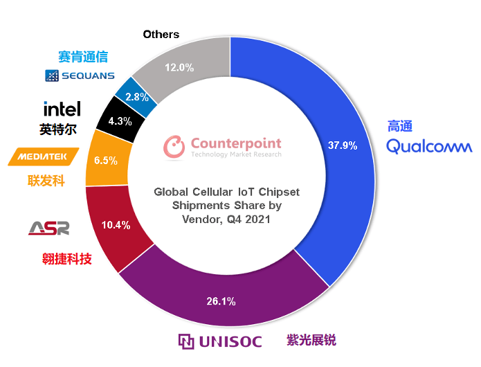 幾乎所有物聯(lián)網(wǎng)終端都需搭載IoT通信芯片,因而通信射頻芯片能夠直觀反映物聯(lián)網(wǎng)行業(yè)的成長周期與終端需求,堪稱行業(yè)風向標。在Counterpoint發(fā)布的全球蜂窩物聯(lián)網(wǎng)芯片追蹤報告中,高通、紫光展銳、翱捷科技、聯(lián)發(fā)科、英特爾、Sequans、華為海思等占據(jù)了大部分市場份額。